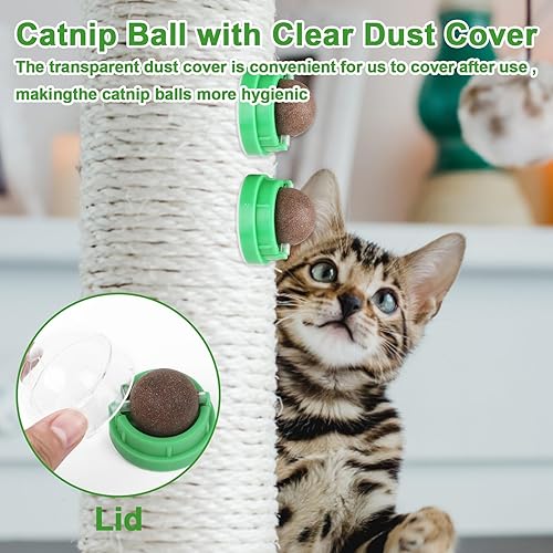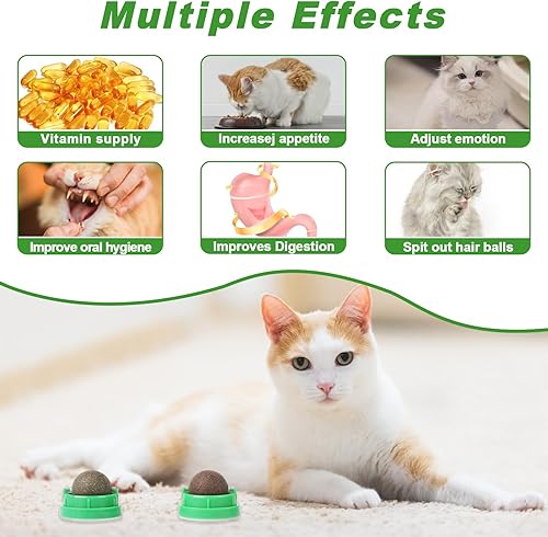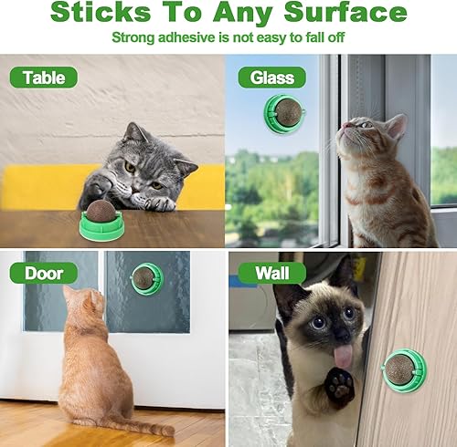 Unique Design:These catnip toy can easily stick to the wall or other surfaces with strong viscous force, no falling off. And the cat mint ball rotates 360 degrees when your cat licks or plays.
