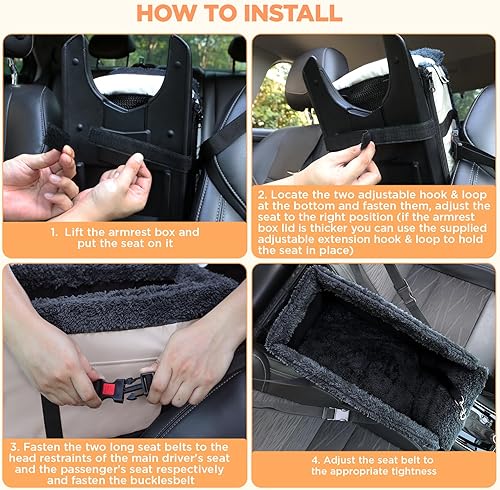 【Safe Console Dog Car Seat 】Sturdy PE Board support for your pet, 3 sides is filling in foam and the front pillow filling in PP cotton.Its soft for your dog to be able to rest his head.The two adjustable seat belts seat stays securely in the center console,prevents it from sliding around in the car.Improve stability and better protect the safety of your pet.