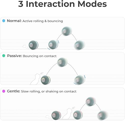 3 Interactive Modes: Cheerble Ball is specially designed for active, bored and timid adult cats and kittens. It has 3 interaction modes: Normal, Passive, and Gentle mode. Upon being turned on, it will automatically move, shake or bounce, among which you can switch to fit for different cat plays. In the meantime, the cool LED lights will be on when the ball is operating, attracting cats to chase and capture it, stimulating their hunting instincts.