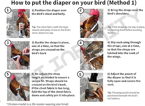Chicken / duck diaper SIZE that FITS - Our design has been tested and iterated on over 10+ times to ensure the perfect fit for a variety of bird sizes. Please refer to the size chart to determine sizing. (Note: The diaper should always rest BELOW THE BIRD'S CROP. The straps should be snug but not too tight.)