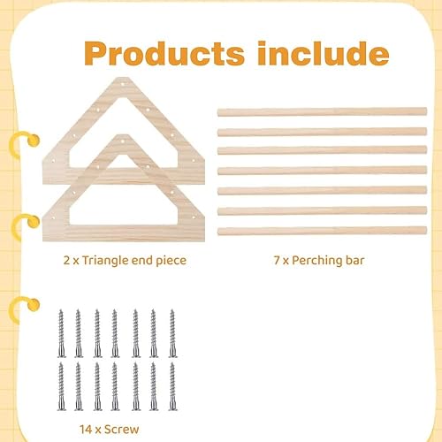 【Easy to Assemble】 Both triangle end boards and perching rods have pre-drilled holes, quickly assembled together with the screws included, with no tools or instructions required. Simply connect them with screws and tighten them with the bolt driver
