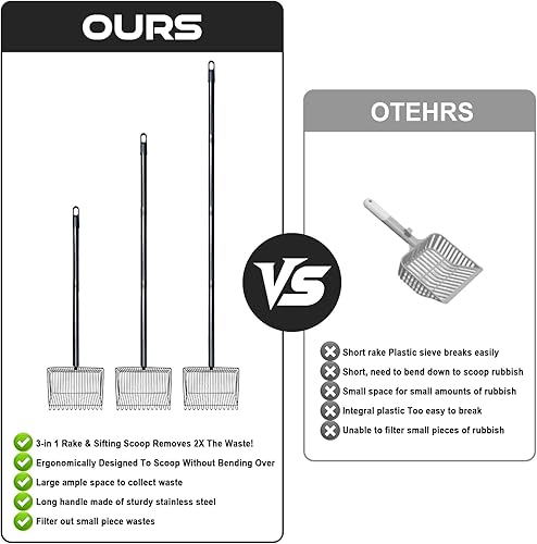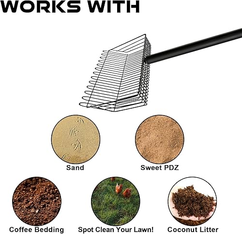 VERSATILE DESIGN: 2-in-1 rake and sifting scoop combination efficiently removes chicken coop waste while separating debris through perfectly sized holes
