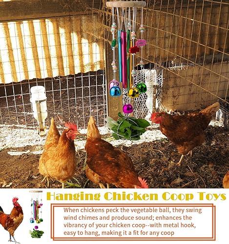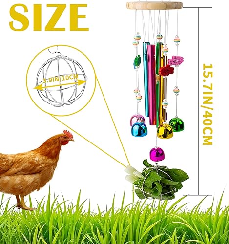 CHICKEN WIND CHIME TOY WITH TREAT BALL: Chicken toys for coop is made of various colorful wind chimes, vegetable holder Ball, metal hook, 6 large size bells and 4 wind chimes tubes for a bright colors appeal. When chicken pecks at ball toy, it will swing wind chime and makes beautiful sounds, as if playing a nice piece of music, chicken will surely like it