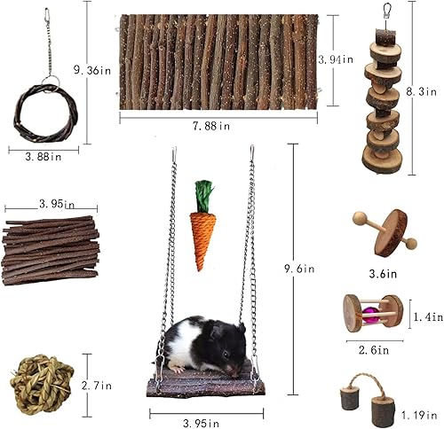【Hamster chew toys sets】: 1 apple wood Round Teeth Grinding Block,1 apple wood hamster hammock,1 hamster swing,1 apple sticksbridge hamster hideout,1 apples wood molar string,1 hamster wheel, 1 unicycle,1 hamster ball,1 woven carrot,50g apple wood sticks,Helps Small Animals Combat Boredom, Anxiety and Stress