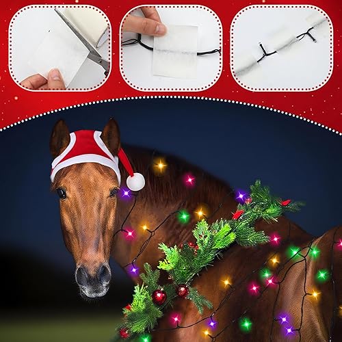 Horse Christmas Costume Set: you'll receive a red Santa Claus horse hat, a 65.62 ft/ 20 M long light string with 200 lights, a remote control, and adhesive tape; You can use the tape to secure the LED light string to your horse during Christmas, giving it the most dazzling look