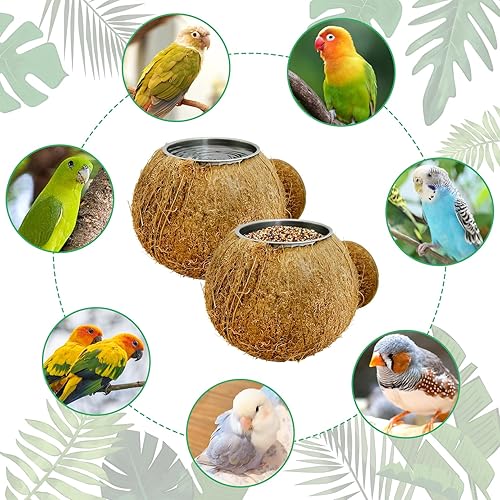 Bird Food and Water Bowls for Cage: Bird coconut bowl set include two coconut shell for birds (size about: 4.72 inches), two stainless steel bird feeding cups (diameter about: 3.12 inches), and one plastic refilling spoon