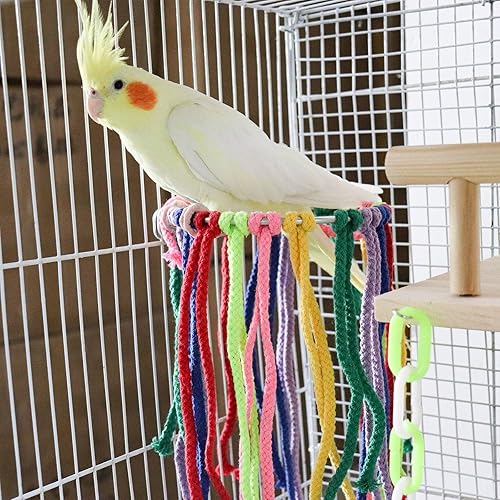 【Safety Material】: Dozens of colorful cotton laces wrapped around a metal ring make up this bird chewing toy, which is safe and reliable. These colorful cotton ropes are durable and can be used for a long time. Colorful cotton ropes are also beautiful decorations for bird cages.