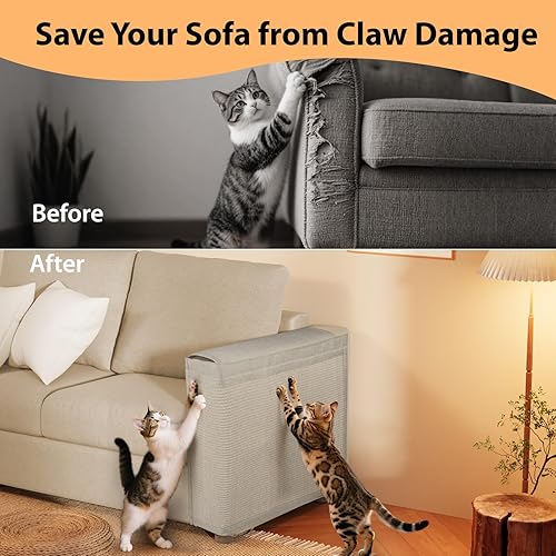 【Dual-Layer Protection Design】The front side of scratch protector mat features high-quality sisal for cats to scratch,while the reverse side has a durable fabric backing that contacts the sofa surface,preventing wear and tear.This dual-layer design offers double protection for your sofa.Unlike adhesive scratch pads or protector tapes, the soft cloth backing won't damage your couch fabric or leave sticky residue.This makes it a durable and long-lasting solution for couch and sofa scratch protection