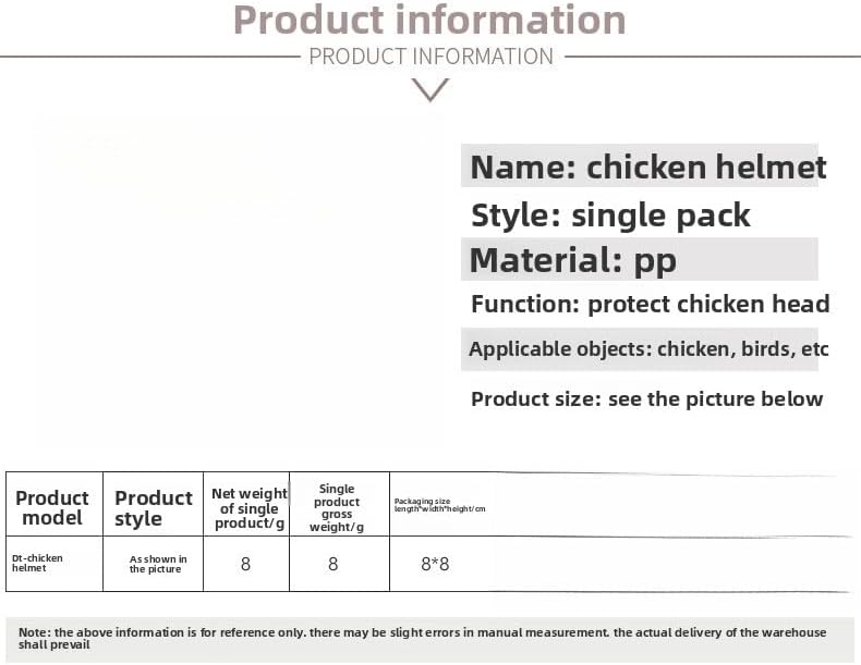We know the destructive power of birds of prey overlap. The helmet is carefully crafted from high toughness engineering plastic and is sturdy enough to withstand the claws and bite, as if wearing a "hard hat" for a chicken, greatly reducing the risk of predators success. Let your chickens free foraging, sandbathing, socializing in the lawn, garden, and you can put down the big stone