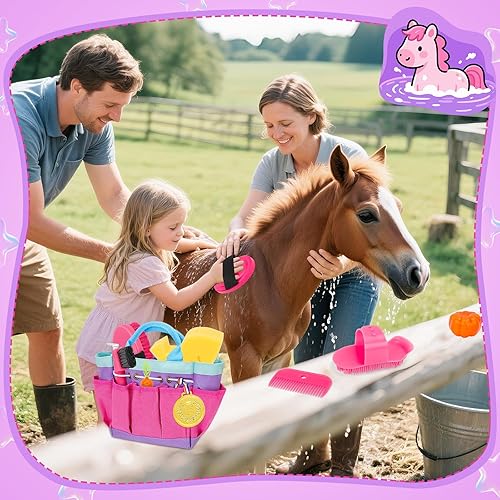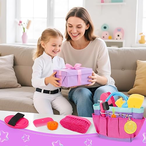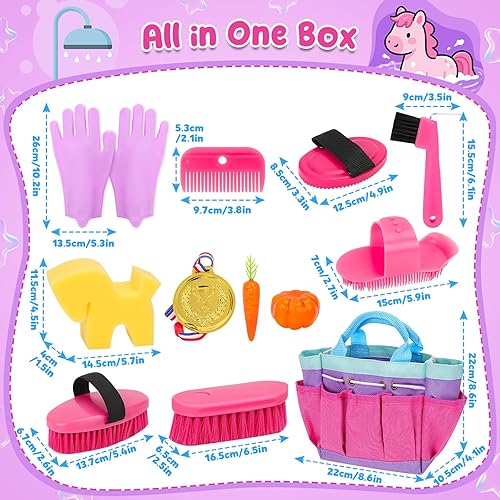 12-Piece Grooming Set: This 12-piece horse grooming toy set includes six brushes: hoof scraper, massage brush, soft brush, hard brush, plastic brush, and mane comb, plus wash horse gloves, sponge, plastic fruit toys, medal, and storage bag. Kids can enjoy hands-on play while learning horse care, responsibility, and patience.