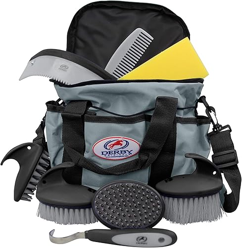 CONTAINS NINE ITEMS - This grooming set includes a matching carry bag, a bathing sponge and sweat scraper for bath time, a hoof pick, mane and tail comb and brush, a dandy brush, a soft brush, and a rubber curry comb.