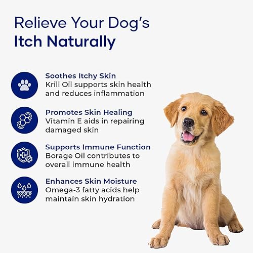 Krill Oil: Rich in omega-3 fatty acids and Astaxanthin, may reduce itching in dogs by supporting skin health, reducing inflammation, and promoting moisture retention. Its anti-inflammatory properties can help alleviate symptoms of allergic reactions and improve overall skin comfort in dogs.