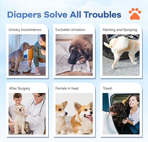 Helpful And Training Your Dog;The stretchy waist diapers are perfect for dogs suffering from urinary incontinence, older dogs, handicapped dogs, male and female dog marking, puppy training, female dogs in heat cycle, surgery recovery, excitable urination, dog diapers male, cat diapers and travel. These dog pads make your pet and life easier