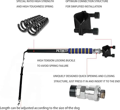 ☺️[Dog Hands Free Leashes] dog bike leash main body made of alloy steel, built-in compression spring, the rope has a high strength, can withstand 1000 pounds of tension, self-research tying technology, durable, collet installation inside the pad silicone film, to prevent scratching the bike paint, tighten without nuts, installed directly and quickly connected on the Straight shank is fine.
