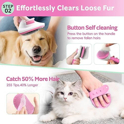 Healthy Coat and Reduced Shedding: Include 2* pet hair remover gloves,1* dog grooming brush with a dual-sided design. Our grooming brush is perfect for dematting and deshedding your pet's coat! With a dual-sided design, use the 9-teeth side to tackle stubborn mats and tangles and the 17-teeth side to thin out and deshed your pet's fur. The deshedder brush for dog allows you to easily and safely remove mats, tangles, knots, and loose hair. Hair remover glove with enhanced 255 silicone grooming tips for a soft and relaxing massage;It also easily removes dirt and shedding hair from your pet body.