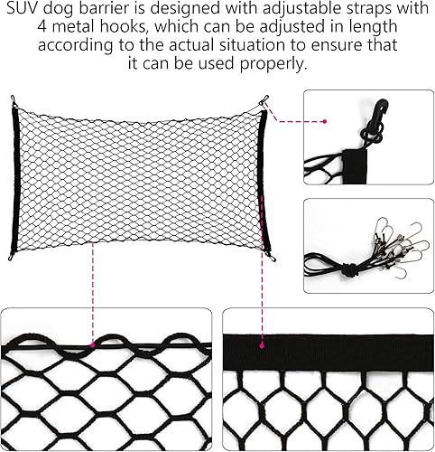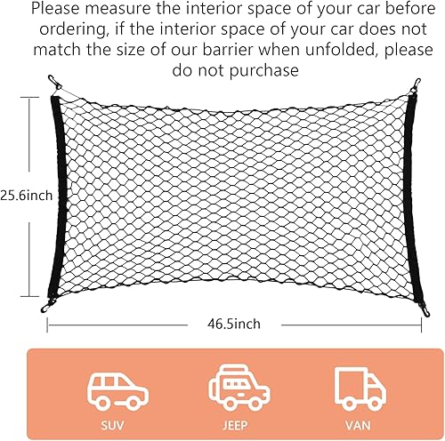 Pet barrier net measures about 47 x 27 inches,Our adjustable car divider for dogs is suitable for most SUVs, cars, trucks, and more, ensuring a secure and comfortable ride
