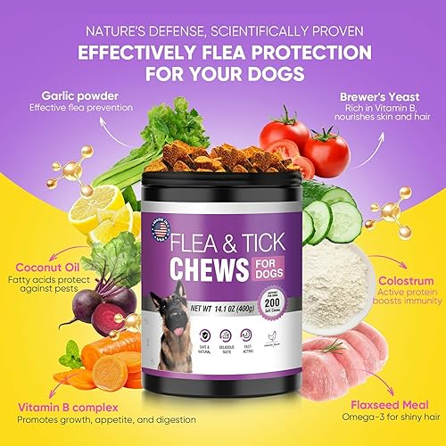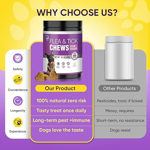 Flea treatment dogs chewable long term protection: Flea and tick for dogs chews comes with 200 per bottle. One bottle of flea and tick chewables for dogs can provide effective and sustained protection for dogs for several months. Reduce the trouble of frequently buying flea and tick chews for dogs, flea treatment dogs chewable to keep your pet in a happy and comfortable environment,while also ensuring that dogs are protected from fleas and ticks for a longer period of time.
