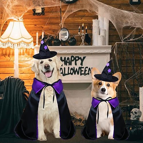Dog Witch Costume: This set of dog Halloween costumes include 1 black and purple dog witch cloak and 1 dog witch hat. This funny dog Halloween costumes will make your pup look adorable and add more fun to Halloween.