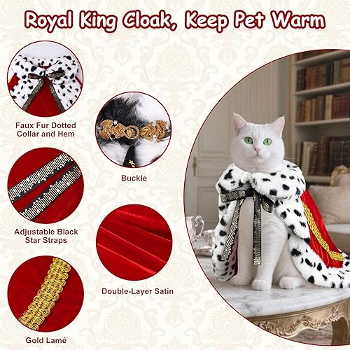 King Cloak for Dogs Cats: Transform your pet into an adorable and elegant little king with this royal red cat Halloween costumes featuring a plush faux dalmatian ermine collar and trim, and super soft double-layer velvet fabric, comfortable for pets to wear for long periods while keeping them warm! A gold-tone clasp at the neckline, star-patterned ribbon strap and decorative gold braid on the back elevate your pet’s royal charm - perfect for a royal Halloween look.