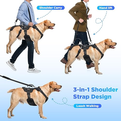 【Dual Handles & 3-in-1 Shoulder Strap】This dog lift harness with handles makes mobility assistance easier and safer. The two padded handles give you firm control when helping your dog into the car or up the stairs, while the detachable shoulder strap offers 3 ways to use: wear over your shoulder for reduced strain, hand-carry for steady support, or convert to a dog leash for everyday walks after recovery. A practical and comfortable dog support sling for large dogs that adapts to every situation.