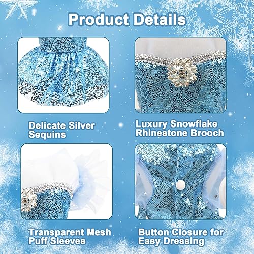 Dazzling & Beautiful Design:Littledropet dog tulle dress is designed for ultimate glamour, this dazzling outfit features a sparkling ice-blue tulle skirt adorned with delicate silver sequins that catch the light with every step, paired with transparent mesh puff sleeves and snowflake rhinestone brooch at the back for a fairytale-like silhouette that adds a touch of royal elegance.Let your furry princess shine like a true Snow Queen