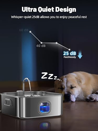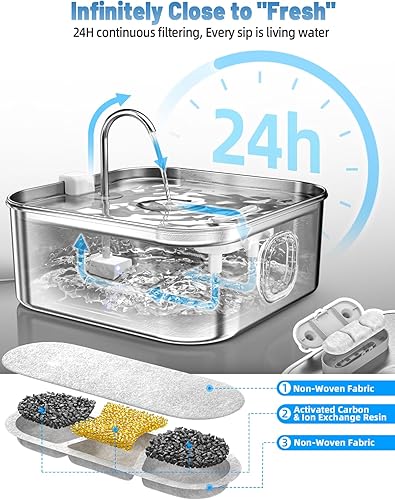 4-Layer Filtration System: The stainless steel pet fountain uses 4-layer filtration systems. The carbon filter consists of high-density filter cotton, activated carbon, and ion exchange resin, and there is a pre-filter sponge on the pump. They offer various purification functions, from trapping hair and small debris to softening hard water and filtering out invisible particles, providing pure and healthy water for your pet.