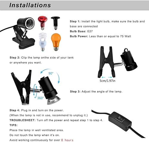 【Package】 Includes 1 * Heat Lamp , 1 * 50W E27 basking Bulb , 1 * 35W E27 basking Bulb(3000+ hours life certification). Cord length approx 4.59 FT. Clip opening up to 1 inch.