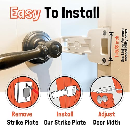 Compatibility: 1. Works with standard left and right swinging interior doors 1-3/8 inches thick. NOT compatible with thick exterior, pocket, barn, or accordion doors. 2. Works with standard strike plate with screw holes 1-5/8 inches apart. 3. Not suitable for wide/extended door frames. Measure screw hole to front of door frame. Must be less than 1-3/8 inches (images in listing below). 4. If there is a wall/cabinet/appliance right up against the door opening, it may not leave enough gap for chonky kitties.