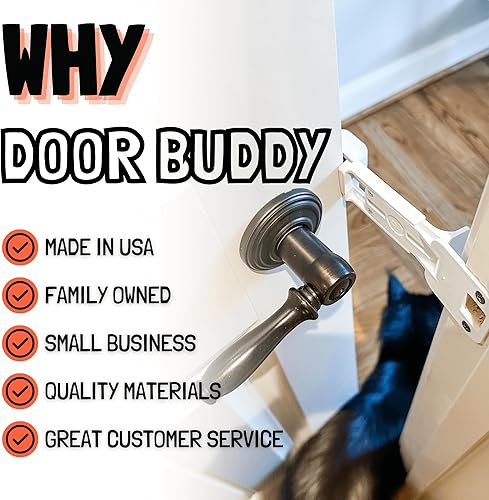 Patented and Made in the USA - Door Buddy Pet Door Prop is patented (#11591836), small business owned, parent-invented, and made in the USA. And; unlike cheaper, less durable, imported, and copycat pet door holder options, Door Buddy is the original, is affordable, and made with high-quality materials. Give Door Buddy a try today and see for yourself why thousands of pet owners have loved and trusted Door Buddy Door Latch products since 2015.
