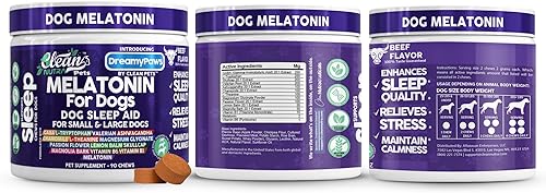 Melatonin For Dogs : Clean Nutraceuticals packs l-Tryptophan, valerian, magnesium, ashwagandha and melatonin gaba into savory 90-count chews that transform restless nights into restorative snoozes. These dog calming chews blends chamomile, lemon balm and magnolia bark to create a science-backed sleep supplement supporting dog anxiety relief during travel, storms or fireworks in delicious beef flavor.