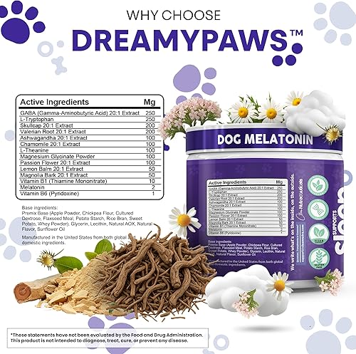 Melatonin For Dogs To Sleep : Drift into deep sleep with valerian root for sleep, skullcap, magnolia bark extract, passion flower extract, l-theanine, vitamin B6, B1 vitamin, and bioavailable magnesium glycinate powder that soothes overstimulated pups from dusk till dawn. Unlike magnesium glycinate gummies, flavored magnesium spray or calm gummies, our veterinarian-formulated chews rely on research-grade plant actives to nurture balanced mood and deep canine relaxation.