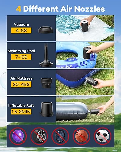 【4 Nozzles Optional】This balloon air pump electric comes with 4 types and sizes of nozzles to inflate or compress different sizes, no need to buy extra nozzles, ideal tool for your pool toys.