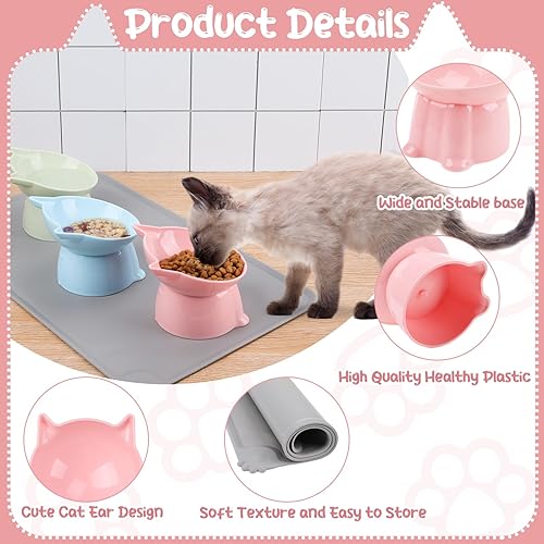 Safe material & suitable size: Our cat food bowls elevated is made of safe plastic material, which is harmless and don't have toxic, ensuring no harm to cats. these cute cat bowls are 13.5 cm/5.3 inch in diameter, with a base height of 8 cm/3.1 inch and a width of 11.5 cm/4.5 inch. the mat can accommodate three cat bowls at the same time without creating a mess.