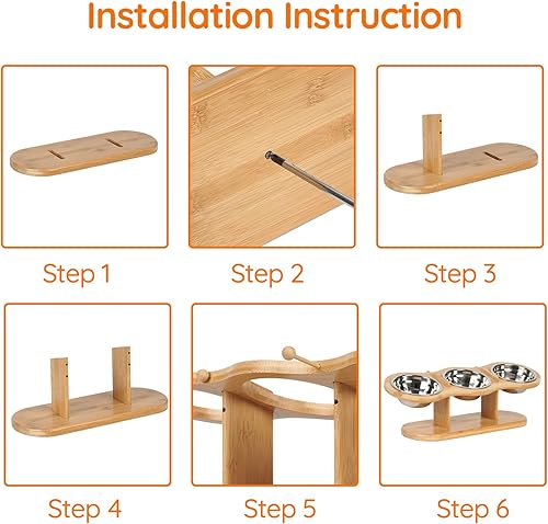 Easy installation : This 3 bowl dog feeder is equipped with 4 screws and 4 sticks, of which 2 screws and 2 sticks are spare. You only need to fix the two boards with inclined surfaces on the base with two screws, and then according to the height you want, align the two sticks with the two small holes and insert them directly into the small holes, then you can get an amazing elevated cat bowl stand