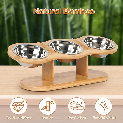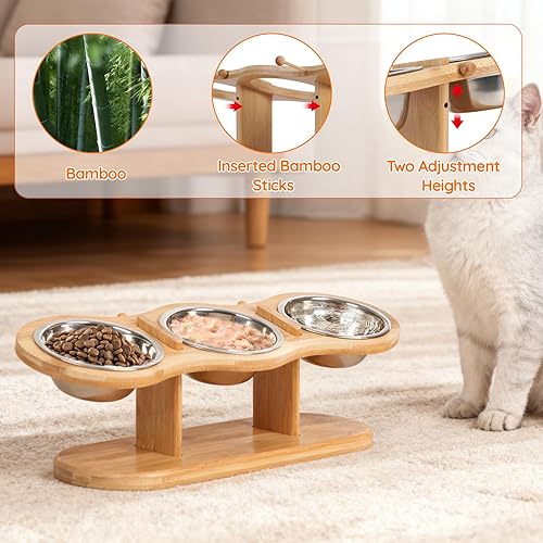 3 Bowl Cat Feeder : This raised cat food and water bowl stand includes 3 stainless steel bowls that are strong, easy to clean to maintain hygiene and cleanliness and avoid cat black chin, making it better for your pet to eat and more convenient and easier for you to take and replace the bowl