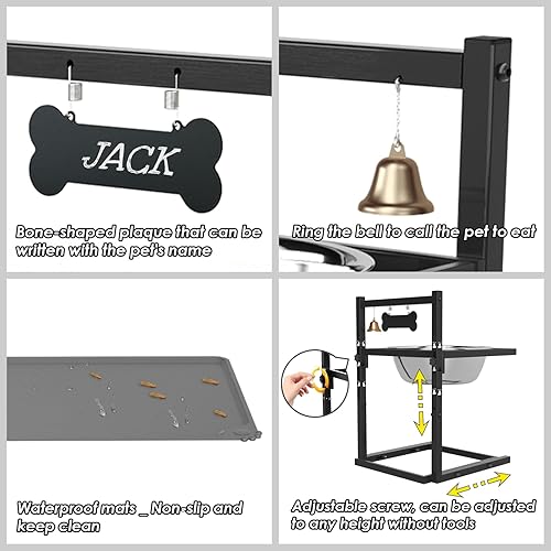PET INTERACTION: Special bells can be used to call your pet to eat. This dog bowl holder kit comes with a free white pen that you can use to write on the sign. Spilled water and food will land nicely on the mat