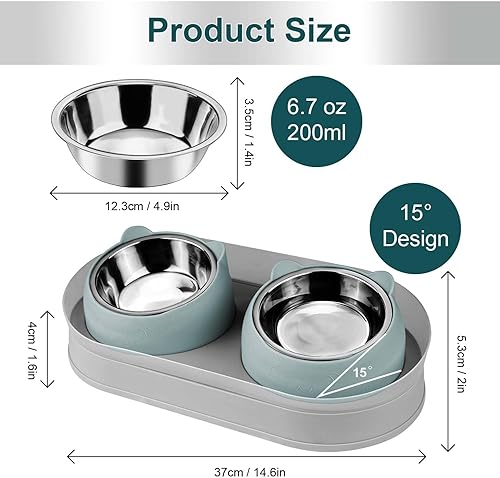 Double Food and Water Bowl:Raised double cat bowls help your lovely kitten puppy with eating and drinking. two cat food dishes can be fed with two different food at one time dry food or wet food or a little water. the feeding bowl are 4.9'' wide to prevent whisker fatigue, help your pet enjoy every meal time