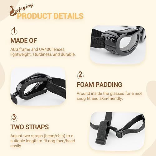 Composed of lightweight ABS frame, uv protection lenses and 2 fixed straps. Eyecups are deep enough to hold the dog eyes, featuring foam padding inside to enhance comfort and safety, protects dog eyes without irritation.