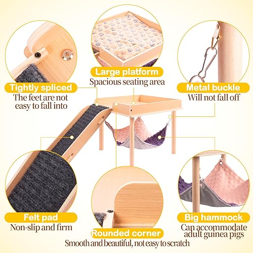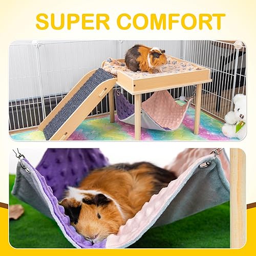 【LARGE SIZE】Platform:12.99x12.99 in, Hammock: 11.81x11.81 in, Stairs:13.78x6.30 in This guinea pig hammock and platform is designed to be large and suitable for guinea pigs of all ages. There are guardrails above the platform to protect the guinea pigs. The stairs are wide enough with felt pads on them so the guinea pigs can easily climb them. This design can help guinea pigs exercise and play well.
