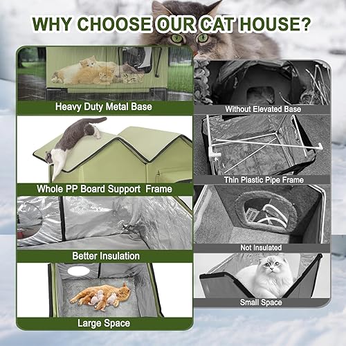 【Elevated & Upgraded Waterproof】This large outdoor cat house for winter features a waterproof PVC coated mesh roof, a door eave, and a double-layer door cover to block cold air, rain, snow, and heat loss. A removable 5.9" elevated base protects cats from ground moisture, ensuring a dry, warm environment.