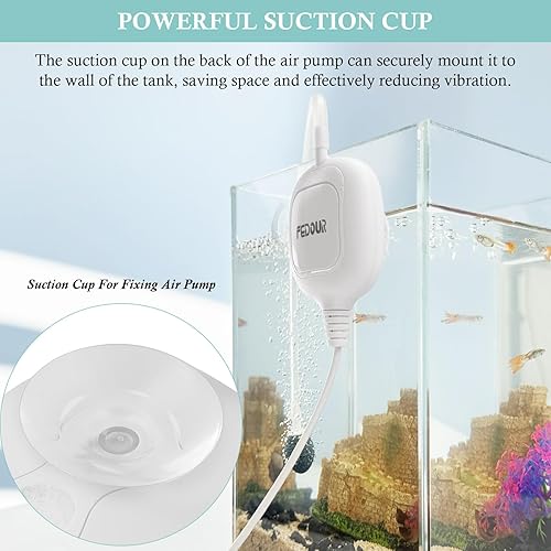 【Suction Cup Design】This fish tank air pump is equipped with a powerful suction cup at the back, which can easily fix the air pump on the fish tank wall without slipping off. The suction cup design can also further reduce vibration during operation, and when the air pump is installed on the fish tank wall, you can hardly hear any sound.