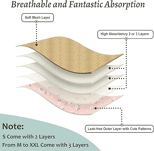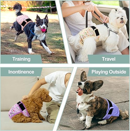 Rapid Absorption and Leak-proof: Washable doggie diapers for female dogs are hygienic and safe, consisting of a breathable bird's eye mesh hollow knit lining, multiple layers of highly absorbent fleece fabric, and outer fabric with an attached waterproof membrane. Doggy diapers prevent liquids from leaking out and soiling sofas, blankets, floors, and other furniture in your home. The comfortable contact lining of the dog underwear diapers protects your dog from blood and urine stains