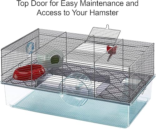 Easy Maintenance Hamster Cage: Top panel features an access door & entire wire portion & middle plastic section of the cage disconnects from the transparent base for easy cleaning access