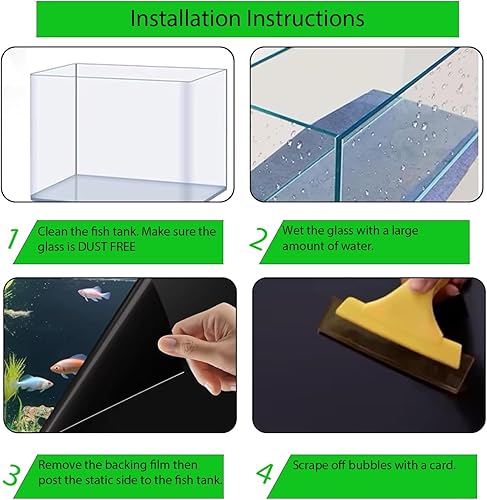 Easy Installation: Clean the fish tank glass surface with water to remove dust. Peel off the transparent protective film from the aquarium background. Spray water on both the glass and the background. Attach the black background to the glass and use a card or squeegee to remove air bubbles. Trim any excess background. No glue, adhesives, tape, or gel required.