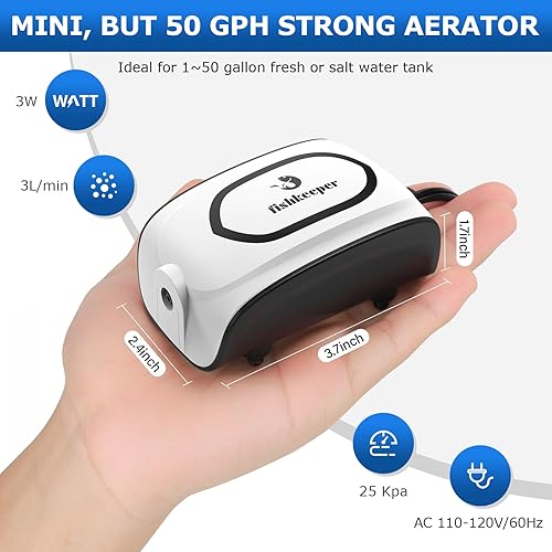 ✦【 50 GPH Power Mini Fish Tank Air Pump】3.7 * 2.4 * 1.7 inch compact design aquarium oxygen pump, can provide 50GPH excellent output flow, 3W power, 25Kpa pressure, 3L/min airflow, ideal for up to 50 gallon freshwater & saltwater aquariums and 4FT deep water applications.