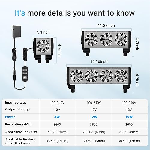 ✦【Fits Various Types of Tanks】 Suitable for all frameless freshwater and saltwater tanks with glass thickness less than 0.59 inches (1.5cm). 1 Fan recommended for tanks<30cm; 3 Fans recommended for tanks<60cm; 4 Fans recommended for tanks<80cm.
