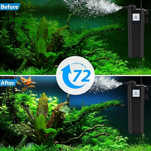 4-in-1 Filtration System – This aquarium filter integrates four key functions: filtration, deodorization, oxygenation, and water circulation. With a flow rate of 132 GPH and a power of 7W, it's ideal for 10-75 gallon fish tanks.