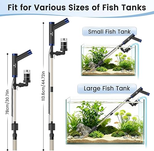 Extended Reach & Compatibility:This fish tank vacuum includes 1*intake tube and 2*extension tubes. Single-tube setup reaches 30.7 inches; dual-tube assembly extends to 44.72 inches. Adapts to various tank depths and water levels for optimized cleaning efficiency.