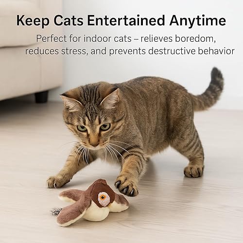 [Flying Fun with Motion Sensor] This flying bird cat toy is motion-activated – simply touch or tap and the wings flap and chirp, keeping your indoor cats engaged and entertained.