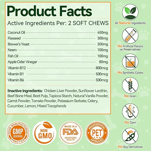 Healthy Skin & Coat: Our natural formula helps address issues like irritation, dryness, and itching caused by flea, while enhancing your dog's overall appearance. Enriched with natural ingredients like Coconut Oil, Fish Oil, and Neem, these flea soft chews promote healthy skin and a shiny coat. Vitamin B12, B1, and B6 help nourish the coat from the inside out. They're free from grains, corn, and soy derivatives, ensuring a natural and safe solution for your pet.